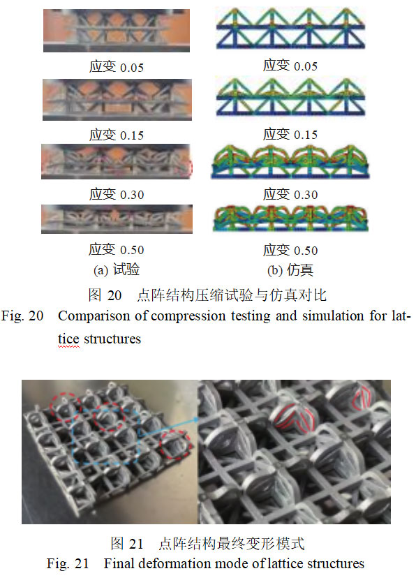 图20对比了仿真和试验结果中点阵结构在不同压缩应变下的变形模式。当应变达到0.05时,上层胞元的十字交叉基座开始变形。当应变增加到0.15时,上层胞元的十字交叉基座发生弯曲变形。当应变进一步增加到0.3时,左右两边的胞元基座与下层胞元接触,上层胞元顶端与下层胞元相接触。当应变达到0.5时,结构达到密实区,整体模型被压瘪。在相同应变下,试验结果与仿真计算结果相吻合。在压缩过程中,结构的压缩变形主要发生在胞元斜杆和十字交叉基座,整体变形呈现对称规律。中间两组胞元的变形过程较为相似,左右两组胞元的变形过程也较为相似。从图21中标红的部分可以看出,点阵结构的上下两个胞元都发生了较大的弯曲变形,上层胞元与下层胞元压缩至贴合,上层胞元的基座和斜杆都发生了大幅度的塑性变形。