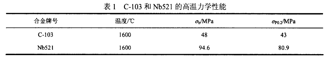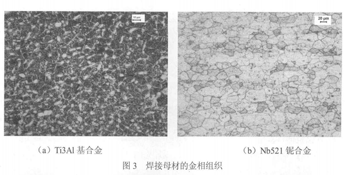 Ti3Al基合金不但具有耐高温、抗氧化、密度低(4.7g/cm²)的特性,且弹性模量、抗蠕变性能比Ti基合金好的多,在高温领域它是替代钛合金的一种很有潜力的材料[4-5]。Nb521铌合金(Nb-W-Mo-Zr)是一种新型的铌合金,其高温强度优于常用的C-103铌合金,性能比较见表1凹。将Ti3Al基合金与Nb521铌合金连接起来制成飞行器发动机,可获得更优异的高温性能,提高发动机的推重比。因此,研究两者之间的电子束焊接对航空航天领域有重要意义。