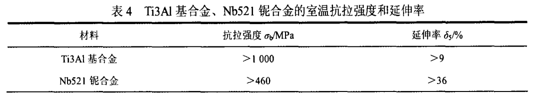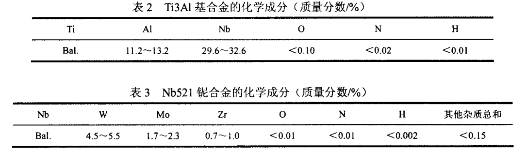 试验所用材料为钢铁研究总院研制开发的Ti3Al基合金(Ti-23Al-17Nb,at%)和西北有色金属研究所研制开发的Nb521铌合金,供货方提供了2种材料的化学成分与力学性能,见表2~表4。