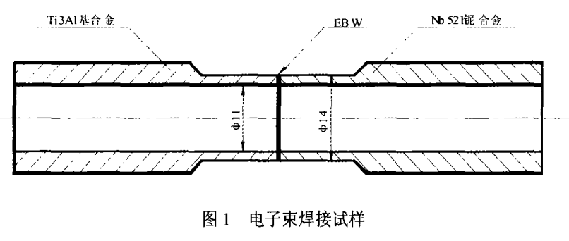 Ti3Al基合金、Nb521铌合金2种材料均选取Φ20mm的棒材,通过机械加工为外径14mm、内径11mm的管状对接试样,见图1。焊前接头用丙酮清洗,去除油污,烘干。通过V铁定位点焊固定,然后进行真空电子束焊接。