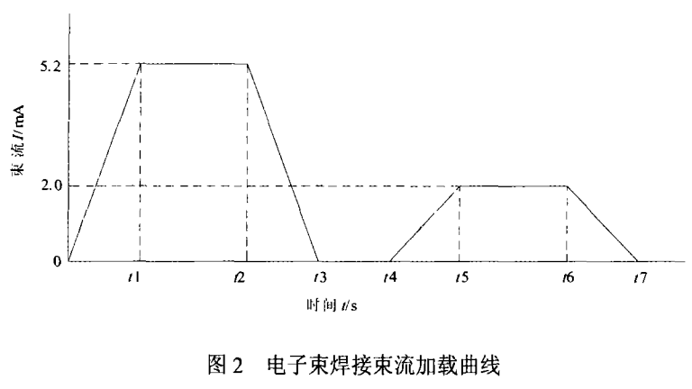 焊接过程按束流曲线分两步完成,见图2。首先使用5.2mA的束流进行电子束焊接,然后使用2.0mA的束流进行修饰焊接。电子束焊接的其余参数为:加速电压150kV,聚焦电流370mA,焊接速度11mm/s,真空度1×10°Pa;修饰焊接的其余参数为:加速电压150 kV,聚焦电流 380mA,焊接速度11mm/s,空度1x10' Pa。