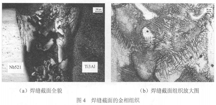 (1)采用真空电子束焊接的方法成功焊接了Ti3Al基合金和Nb521铌合金,焊缝熔合区为急冷的铸态组织,有枝晶花样,存在较大的成分不均匀现象。