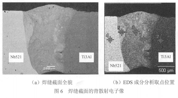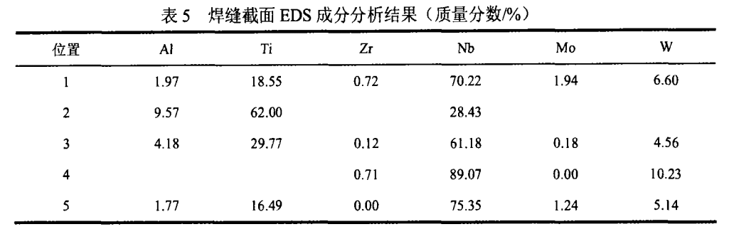 焊缝截面的背散射电子像见图6,明显存在着成分不均匀区域。在焊缝截面选取了5个典型位置进行了EDS成分分析,其结果见表5,可看出图6b中1区、5区的重元素Nb含量较高,3区Ti含量较高,焊缝中存在较大的成分不均匀现象。