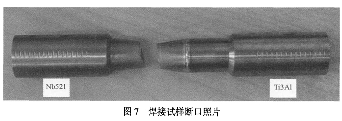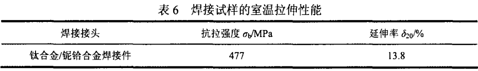 焊接试样的室温抗拉强度和延伸率见表6,断口照片见图7。可看出:断裂发生在母材Nb521铌合金一侧,焊接接头的室温抗拉强度优于母材Nb521铌合金,上述焊缝部位的成分不均匀对室温抗拉强度的影响不敏感;此外,焊接试样的延伸率介于Ti3A1基合金和Nb521铌合金之间,表现出较好的塑性。