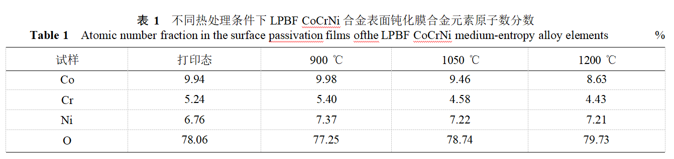 综上可知,当LPBFCoCrNi合金表面钝化膜中合金含量较高时,表面钝化膜致密性较高,耐蚀性能较好。同时,Cr和Ni作为影响钝化膜耐蚀性能的主要元素,当900℃热处理后,钝化膜中Cr含量(原子数分数)最高,约为5.40%,Ni元素含量最高,约为7.37%,耐蚀性能较好,随着热处理温度的提高,钝化膜中Cr、Ni含量逐渐降低,耐蚀性能下降。因此,不同热处理条件下LPBFCoCrNi合金耐蚀性能与钝化膜中合金成分有关。