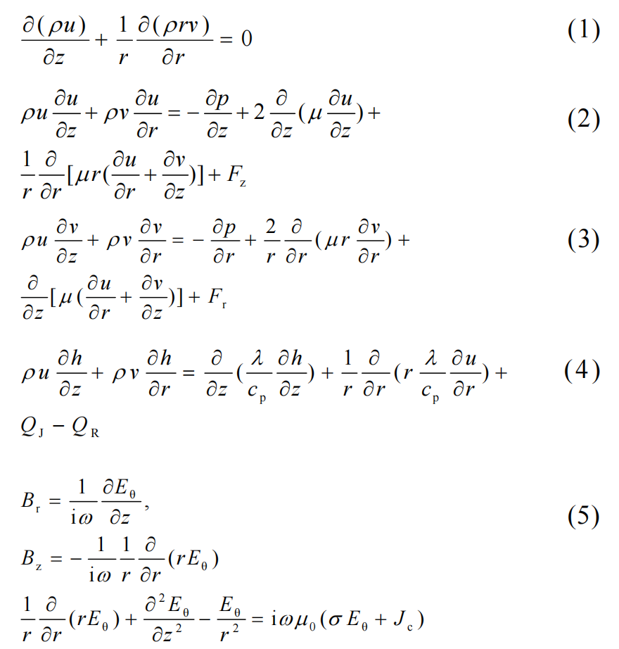 式中,u、v 分别为轴向和径向速度分量;ρ、μ、λ、cp、σ 分别为等离子体的密度、粘滞系数、热导率、比热容、电导率;h、p 分别为焓和压力;QJ、QR 分别是单位体积内的焦耳热和辐射热,Fz、Fr 分别为洛伦兹力的轴向分量和径向分量;Jc、Eθ、Bz 和 Br 分别为通入线圈的电流密度、角向电场、轴向及径向磁场。