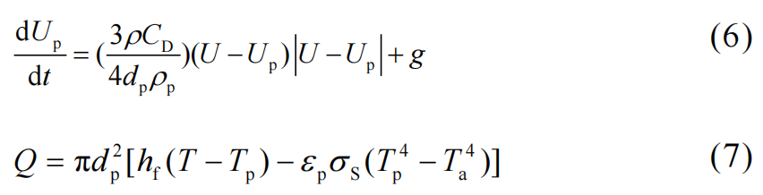 式(6)与式(7)中: ρ、U 分别为等离子体密度和速度,dp 及 Up 分别为颗粒粒径与运动速度;ρp、CD、g 为颗粒密度、阻力系数和重力加速度;hf、T、Tp 和 Ta分别为热传导系数、等离子体温度、颗粒温度和环境温度; σS、εp 分别为 Stefan-Boltzmann 系数和辐射系数。