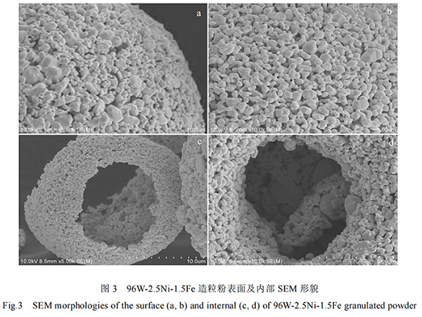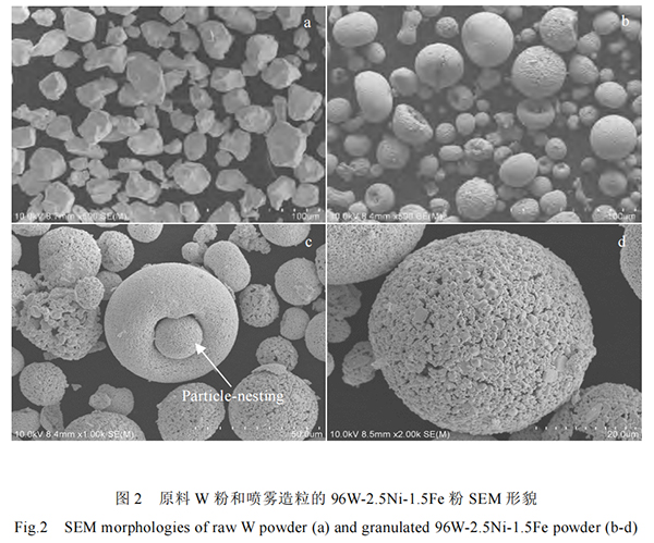 原料 W 粉和喷雾造粒的 W-Ni-Fe 预合金粉表观SEM 形貌如图 2 所示,原料粉末呈不规则块状,喷雾造粒后所形成的 96W-2.5Ni-1.5Fe 粉末表现为显微组织结构疏松的不规则类球形状,且部分为半球状,中空洞较多且表面粗糙、疏松,甚至部分粉末存在凹陷、嵌套或表面开裂等现象(如图 2b~2d)。