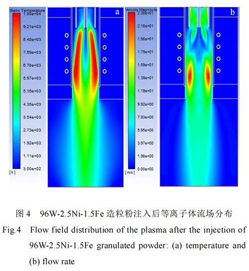 采用磁流体动力学(MHD)理论计算分析颗粒注入后等离子体流场及颗粒的粒径变化过程;采用场发射扫描电子显微镜(SEM)、金相显微镜、X 射线能谱仪(EDS)等粉体性能测试手段分别对 W-Ni-Fe 粉末颗粒的形貌、显微组织、断面形貌及成分等进行分析表征。