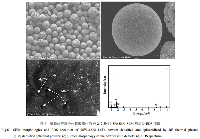 将喷雾造粒后的 96W-2.5Ni-1.5Fe 三元合金粉末通入到射频热等离子体中进行处理,研究发现,经等离子体处理后的粉末呈现较为规则的球形,致密的球形粉表面孔洞及疏松现象有所缓解,但仍存在部分颗粒未致密化或缺陷,如图 6a 和 6b。因此,经射频热等离子体进行处理后 96W-2.5Ni-1.5Fe 三元合金造粒粉末的综合性能提高。分析认为,由于射频热等离子体具有较高的温度,当粉末进入到等离子体流场中时与其发生强烈的热交换作用而熔融,造粒粉的颗粒内部及其表面在高温作用下迅速融化形成液滴,进而在快速冷却过程中的表面张力作用下收缩成致密的球形颗粒。