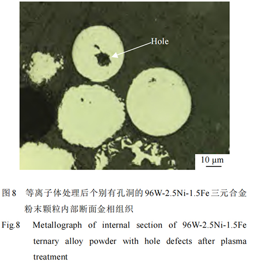 此外,进一步研究还发现经等离子体致密球化处理后极少颗粒的内部存在较大的孔洞,致密化效果欠佳,如图 8 所示。由于大量的颗粒进入到等离子体中时其运动轨迹是一个随机过程,射频热等离子体致密球化过程中对于保证每个颗粒均能够有效熔融而致密是较为困难的;且由于每个颗粒各自重力、粒径及各元素配比不同所引起的物理特性(热导率、换热系数等)不同等多方面因素会导致极个别粉末颗粒的内部存在孔洞等缺陷。