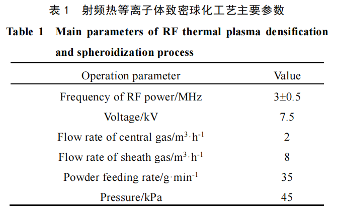 1) 喷雾造粒工艺虽可以实现多种元素之间比例的有效配合与控制,但该工艺所获得的粉末颗粒显微组织结构通常表现为疏松且表面粗糙,甚至部分粉末存在凹陷或开裂等现象,对粉末的后续加工及成形件的性能造成影响;射频热等离子体处理对其致密化和球形化效果较为显著。因此,喷雾造粒与射频热等离子体致密球形化工艺的有机结合可有效提升粉体的综合性能。