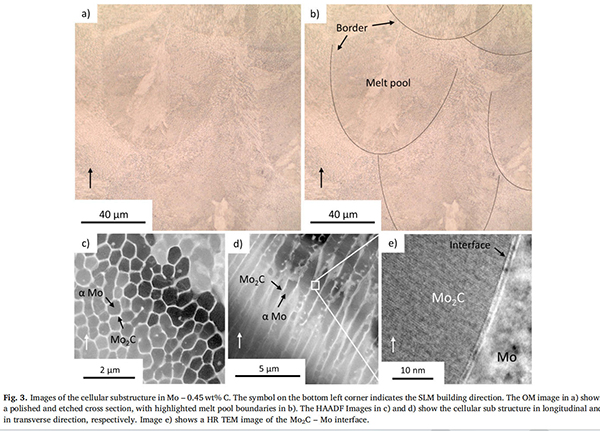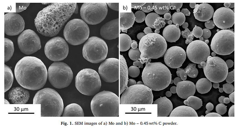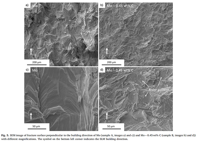 • 与SLM处理的纯钼相比,Mo-0.45 wt% C在三点弯曲试验中的平均弯曲强度提高了340%。1180±310 MPa的强度值处于粉末冶金纯钼的范围内。