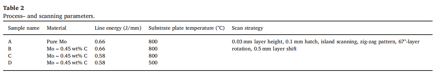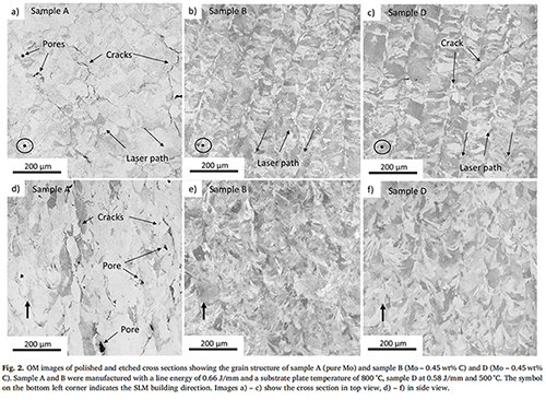 选择性熔化钼的主要挑战是裂纹的形成。Braun等人[5]描述了引发钼中热裂纹和冷裂纹萌生的关键因素。这篇题为“SLM 制造钼和钨——缺陷结构和凝固机制分析”的论文发表在《国际难熔金属与硬质材料杂志》特刊上,与本论文出自同一研究小组。Braun 等人得出结论,氧杂质会导致热裂纹、晶界弱化和凝固温度升高,因此必须消除或控制,例如通过合金化 [5]。
