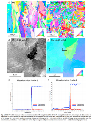 图4 a)和b)中的EBSD图像证实了OM图像。添加0.45 wt% C的钼合金化可减小晶粒尺寸,并抑制外延晶粒生长。相邻的晶胞群被大角度晶界分隔,因此可以称为晶粒(图4 c)和d)。晶粒间的取向差角大于10°,参见图4 e)和f)中的取向差分布图1和2。图4 f)中点对点分布图中的取向差角显示,大角度晶界距离为1.6 μm,晶粒内部的取向差角小于0.5°。