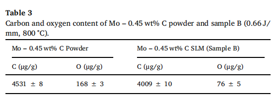 表3比较了Mo-0.45 wt% C(样品B,0.66 J/mm,800 °C)与Mo-0.45 wt% C粉末的碳和氧含量。在烧结过程中,碳和氧的损失分别为522 μg/g和93 μg/g。