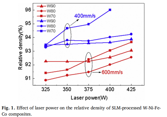 基于ICP分析,确定W90、W80和W70的实际成分分别为91.00%(重量百分比)W-5.94Ni-1.66Fe-1.40Co、82.10%(重量百分比)W-10.90Ni-3.58Fe-3.42Co和72.06%(重量百分比)。由于W的熔点高于Fe、Co和Ni的沸点,SLM工艺导致Ni、Fe和Co元素的蒸发和损失。复合材料的理论密度计算公式为ρT = ∑i3=0 ρ ωi i,式中ρi为各化学成分的理论密度,ωi为各化学成分的质量分数。根据样品的实际成分,计算出W90、W80和W70的理论密度分别为18.3、17.4和16.3 g/cm3。相对密度为测量值除以理论值。图1为在不同激光功率和扫描速度下SLM制备的W90、W80和W70样品的相对密度。所有W-Ni-Fe-Co复合材料(W90、W80和W70)的相对密度随激光功率的增加而增加,随激光速度的增加而降低。同时,随着W含量的降低,相对致密度逐渐增大。由图1可知,在325 W、600 mm/s速度下形成的W70合金快速发生致密化,相对致密度达到91.4%;随着激光功率的增加,W70合金的相对致密度呈现持续增大的趋势,在425 W、600 mm/s速度下达到93.7%;同样,W80和W90合金的相对致密度均随激光功率的增加而增大。当降低激光速度时,W80合金的相对致密度所有样品的相对密度均显著提高。在激光功率为400 W、激光速度为400 mm/s的条件下,W70获得了96.1%的最大相对密度。据报道,合适的烧结温度是获得高相对密度的关键因素[28,29]。