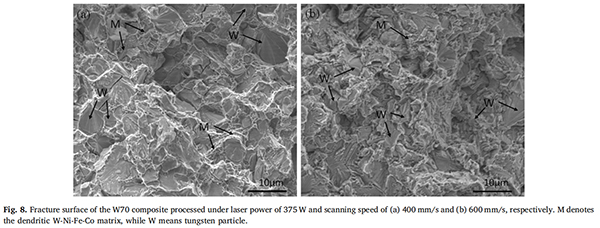 图8为不同扫描速度下W70拉伸试样断口的SEM照片。断口形貌由钨颗粒解理和树枝状W-Ni-Fe-Co基体组成。可以看出,SLM加工的W70复合材料表现出树枝状基体的延性撕裂和钨颗粒的穿晶解理断裂的特征。在低扫描速度(400 mm/s)加工的试样中,可以在树枝状W-Ni-Fe-Co基体中观察到细小的韧窝形貌。如图8(a)所示,W颗粒中的穿晶解理表明基体与钨颗粒之间具有良好的结合力。这与高能量密度下获得的较高拉伸强度相一致。在高扫描速度下加工的样品中观察到钨剥落现象。这些薄弱位置在应力集中下可能成为裂纹的起始点,导致高扫描速度下加工的样品强度相对较低[36,37]。