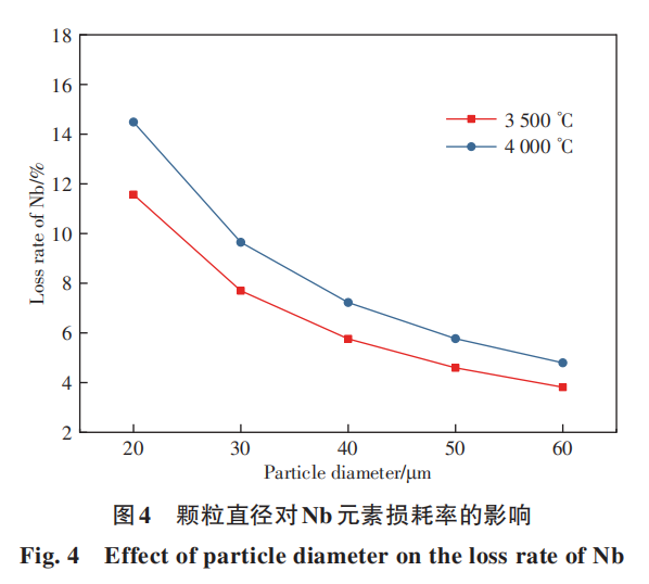 图4为颗粒直径对Nb元素损耗率的影响,可以看出,粒径对Nb元素损耗率的影响更明显,小颗粒的损耗率明显高于大颗粒,因为粒径小较小时,熔化的液滴有更大的比表面积,液滴表面的元素更容易气化挥发。损耗率随颗粒直径减小大幅度提高,4000℃下、20μm粒径的粉末损耗率达到接近15%,而60μm的粉末损耗率只有5%左右。气化损耗不仅会使颗粒平均粒径减小,同时不同粒径气化损耗率不同会导致粉末粒度分布范围变大,因此在原料粉制备时可稍微增加粉末粒度,同时要控制粉末粒度分布在更小的范围内,确保球化后粉末满足3D打印用粉末对粒度的要求。