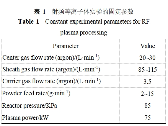 实验过程为:首先,以氩气为中心气和边气建立稳定运行的等离子体炬,输出功率75kW,系统负压85kPa,采用氩气为载气将Nb粉经喂料系统、由送粉枪轴向送入等离子体炬中。粉末在穿过等离子体高温区时迅速吸热、熔融,并在表面张力作用下缩聚成球形,在极短时间内骤冷凝结,形成球形粉末,经粉末收集系统收集,详细工艺参数如表1所列。