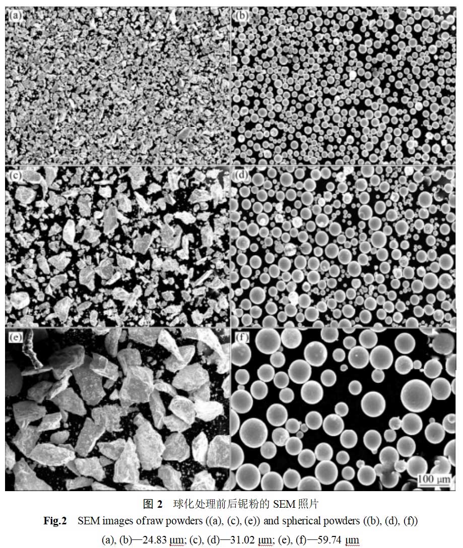 图2所示为送粉速率为2g/min时,粒度分别为24.83、31.02及59.74μm的不规则铌粉球化处理前后的SEM照片。由图2可以看出,原料铌粉经等离子体球化处理后得到球形度高、分散性良好的铌粉(如图(b),(d),(f))。粉末团聚现象消失,球化率可达100%。