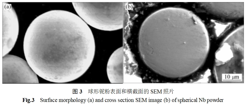 图3为球形铌粉(24.83μm)表面和截面的SEM照片。由图可知,球形铌粉表面光滑、无毛刺、内部结构致密、未发现明显的孔隙等缺陷,说明等离子体可提供足够的能量使铌粉颗粒表面或整体熔融而实现致密化。粉末长径比接近1:1,具有较高的球形度。