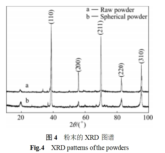 图4所示为铌粉等离子体球化前后的XRD图谱。由图4可知,球化处理前后铌粉衍射峰的位置并没有发生明显变化,其特征衍射峰为(110),(200),(211),(220)和(310),表明铌粉为体心立方结构。球化前后均呈现单一的Nb相,没有出现其它杂质相的特征衍射峰。采用氩气作为等离子体工作气,经射频等离子体球化处理后可以制备单相铌粉。