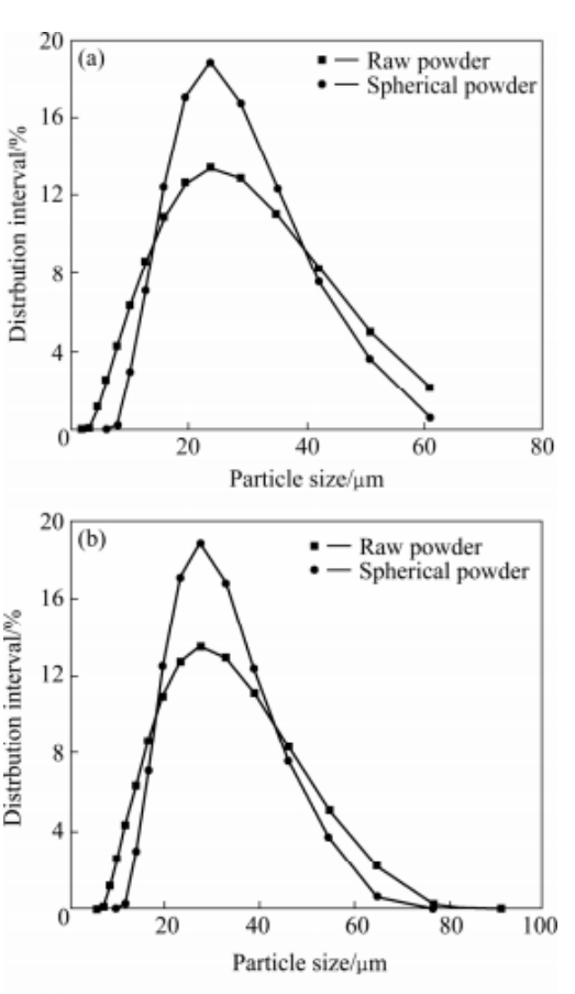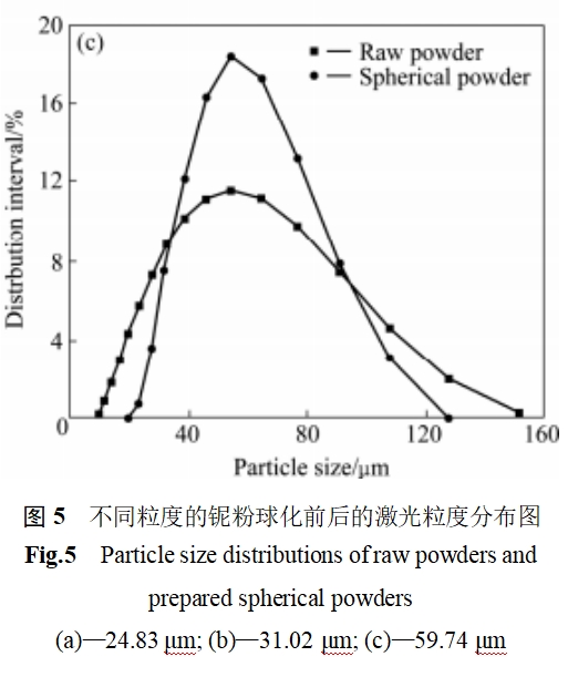 图5所示为3种不同粒度的铌粉球化前后的激光粒度分布图。如图5(a)所示,原料铌粉的平均粒度为24.83μm,经等离子体球化处理后,平均粒度变为25.07μm。可见球化前后的铌粉平均粒度改变很小,但粒度分布曲线变窄,粒度分布更加集中。这主要是由于粉体在穿过等离子体高温区时,细微颗粒(<5μm)迅速熔化为液滴,且飞行速度快,在表面张力作用下,与相碰撞的表面熔化的粗大粒子合并,形成球形颗粒,过于微小的颗粒被快速汽化,随气流进入除尘布袋装置,所以在图中表现为原粉的最小颗粒在球化后不见了。图5(b)、(c)表现出相同的变化规律。