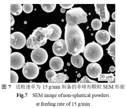 在射频等离子体球化处理过程中,工艺参数尤其是加料速率对铌粉的球化有重要影响。在相同工艺参数下,不同的加料速率,粉末的球化效果不同。图6所示为以粒径24.83μm的铌粉为原料,在不同加料速率下制备的球形铌粉形貌的SEM照片。由图可知,随加料速率增加,铌粉的球化率降低。这是因为加料速率增加,使单位时间内通过等离子体的粉末增多,粉末完成球化所需要的能量增加。而系统在固定的工艺条件下所能提供的能量为有限的定值,不能满足过量铌粉的吸热、熔化和球化的需要,致使粉末的球化率降低。此外,单位时间内进入等离子体炬中的粉末增多,颗粒与发生器中流场的相互作用更加剧烈,造成颗粒运动轨迹杂乱,部分颗粒未能穿过高温区也是造成球化率降低的原因。图7所示为送粉速率15g/min时,铌粉球化处理后的非球形颗粒的SEM照片。从图中可以明显看到:颗粒1、2为典型的吸收能量不足引起的球化不完全,颗粒3表面粗糙,形状不规则,基本保持原粉的形貌,是由于流场作用下杂乱的飞行轨迹使其未能穿过高温区。同时可观察到由于能量不足致使周围部分球形颗粒表面出现不同程度的缺陷。
