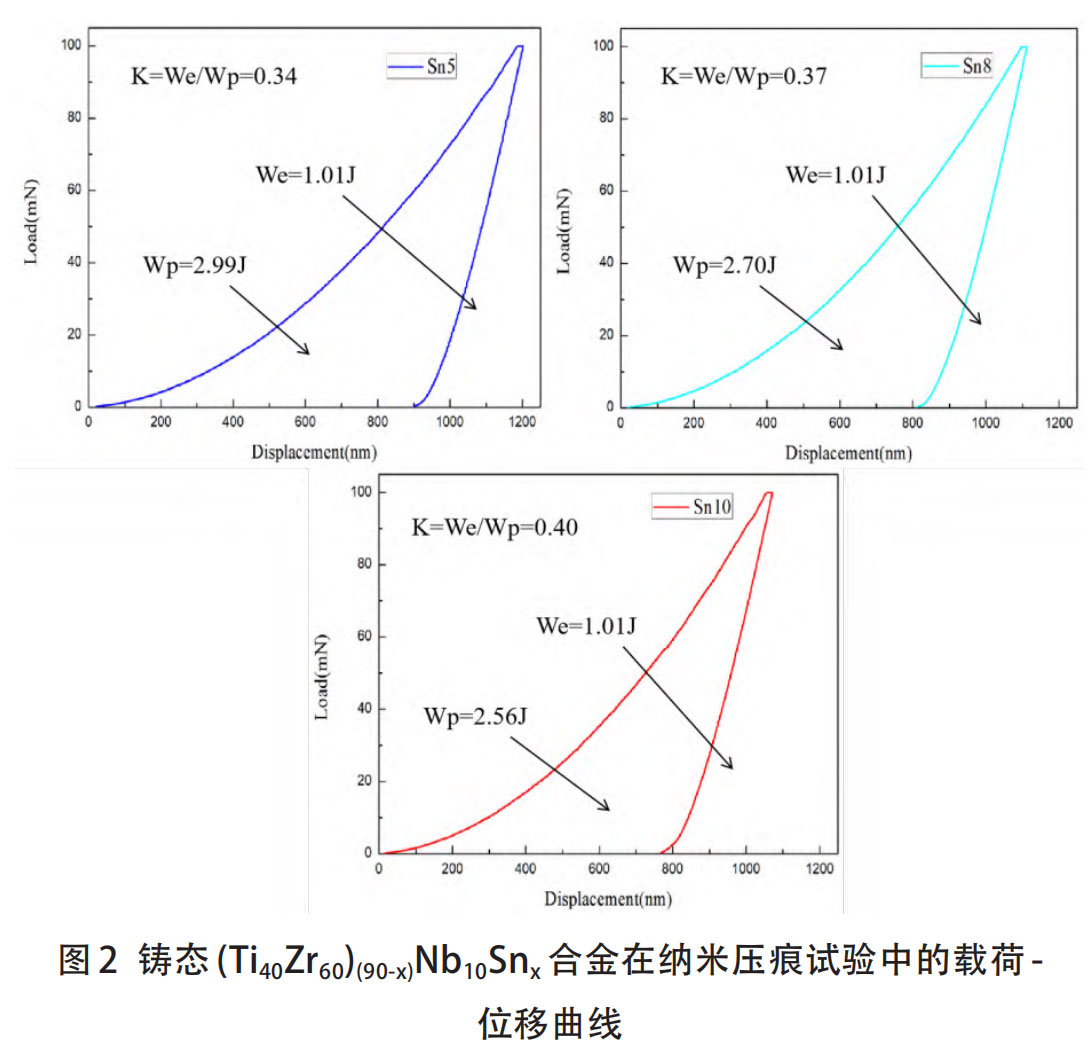 在载荷-位移曲线中,卸载曲线以下的区域代表的是压痕实验中材料的弹性功(We),而卸载曲线和加载曲线之间的区域代表的是材料的塑性功(Wp),二者的比值k可以表征材料的性质。加载曲线与卸载曲线包围的面积可以表征加载过程中合金的塑性变形功,代表发生了多少塑性变形[13]。根据Tuck理论[14],塑性功(Wp)、弹性功(We)和总变形功(Wt)可分别表示为: