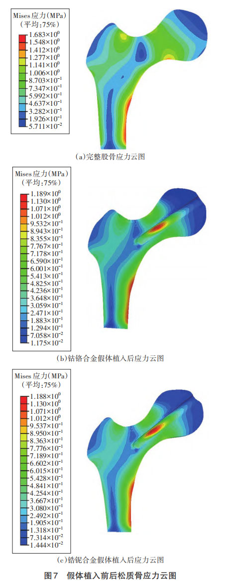 将模型导入ABAQUS软件中进行仿真实验,在股骨假体最高点与所在的面进行耦合,在耦合点上施加350N载荷,对股骨近端的下表面施加位移全约束。结果表明,假体下方股骨各区域由于应力屏蔽,其股骨应力大小分布情况与文献[16]的结果一致。同时,本研究发现,在靠近假体边缘的皮质骨中存在应力集中现象,在股骨头处出现应力屏蔽效应,与文献[17]的结论一致,可以证明构建的模型有效。