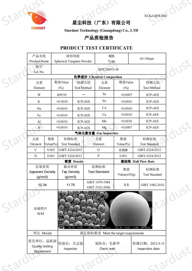球形钨粉采用射频等离子体球化技术制造,具有高纯度、含氧量低、球形度高、表面光滑、无卫星、粒度分布均匀、流动性能优异、松装密度和振实密度高等特点。