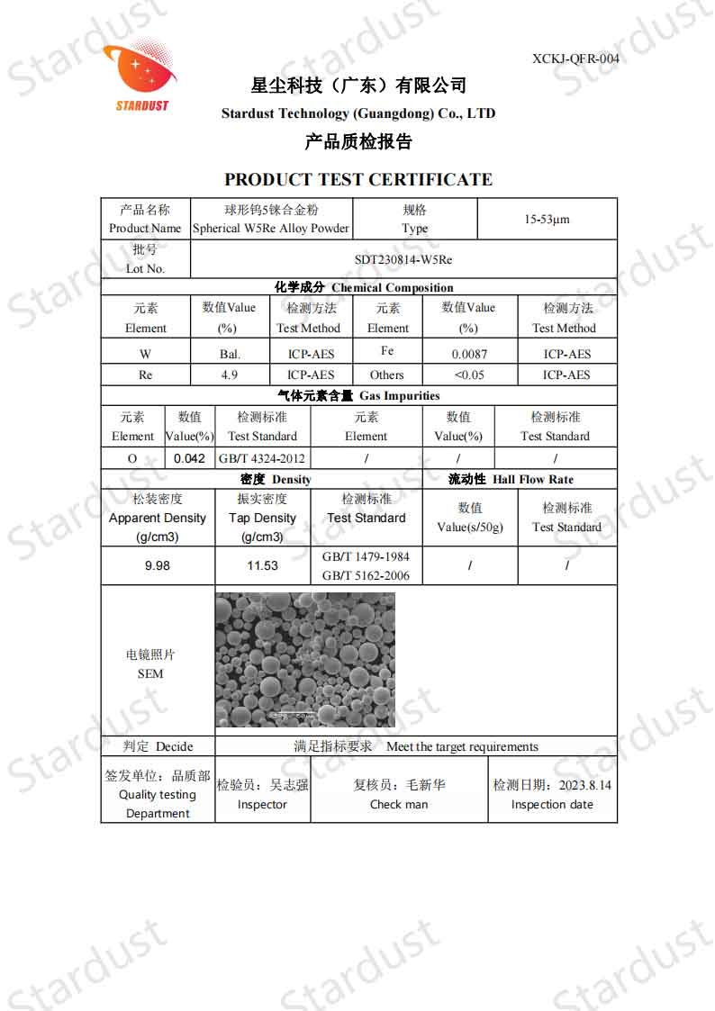 球形W-5Re合金粉末是钨和铼合金粉末,其中钨的质量分数为95%,铼为5%。这种合金粉末在高温、抗氧化、耐腐蚀等方面有优异的表现。