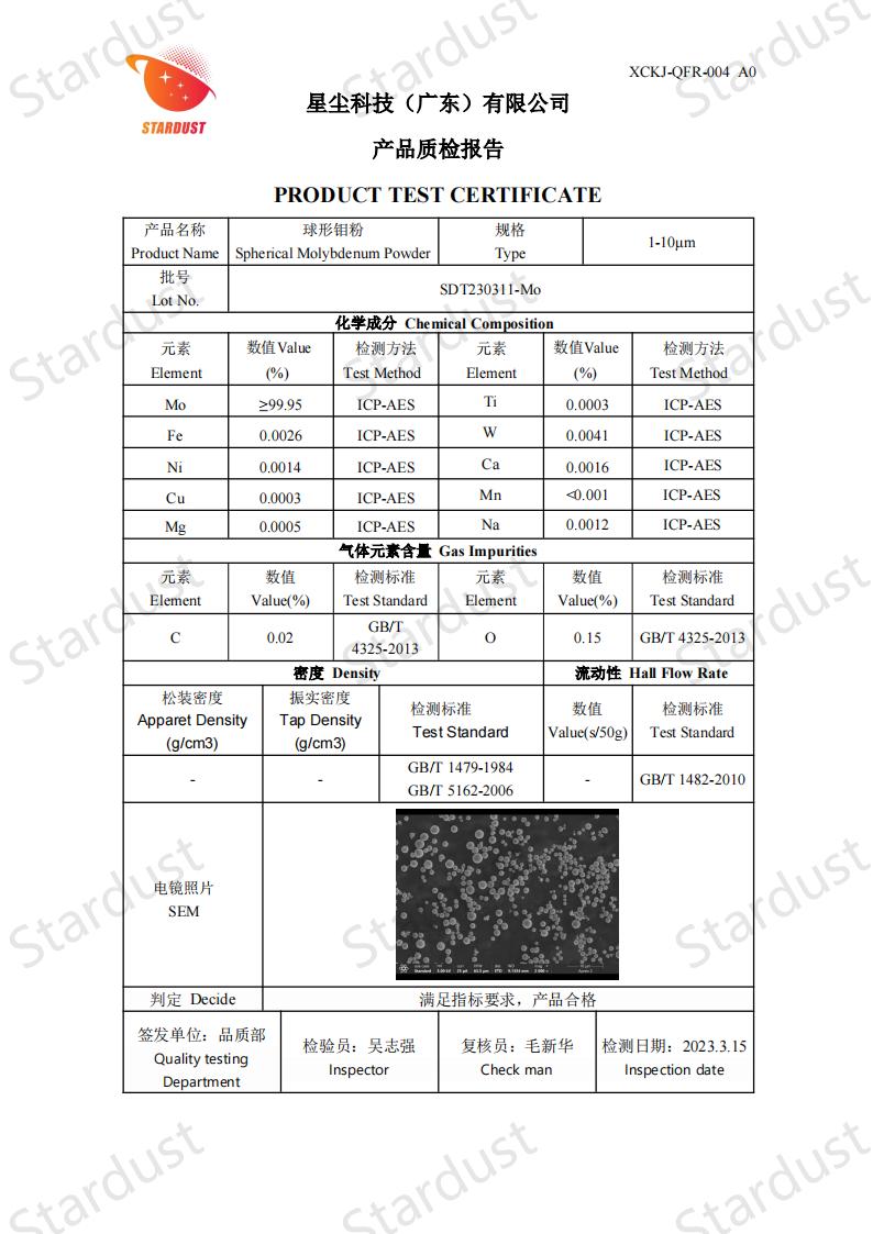 球形钼粉采用射频等离子体球化技术制造,具有高纯度、含氧量低、球形度高、表面光滑、无卫星、粒度分布均匀、流动性能优异、松装密度和振实密度高等特点。
