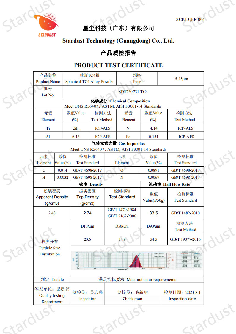 5球形颗粒形态:球形TC4粉末流动性好,适合增材制造(如3D打印)和粉末冶金工艺。