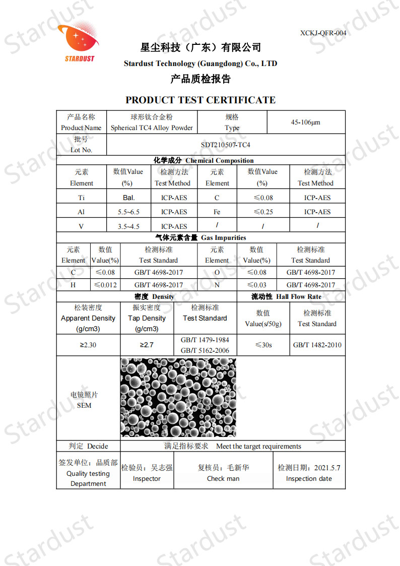 5球形颗粒形态:球形TC4粉末流动性好,适合增材制造(如3D打印)和粉末冶金工艺。