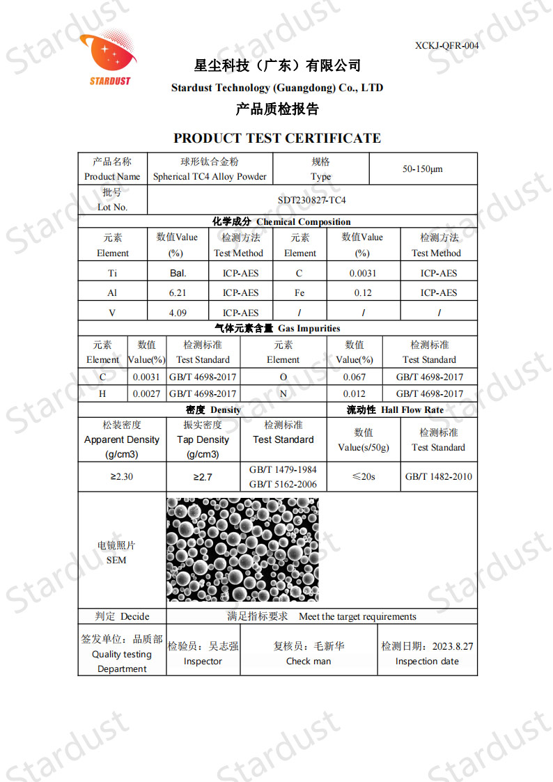 5球形颗粒形态:球形TC4粉末流动性好,适合增材制造(如3D打印)和粉末冶金工艺。