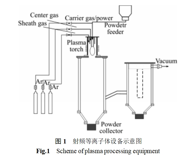 The raw materials used in the experiment are niobium powders of type FNb-2 with Fischer's particle sizes of 24.83, 31.02 and 59.74 μm provided by Beijing Xingrongyuan Company, and the purity of the product is more than 99.9%, and the shape of the powder is irregular. The Nb powder was spheroidized using a self-developed 100kW RF plasma micropowder treatment device, and the experimental setup is shown in Fig. 1. The experimental setup is shown in Fig. 1. It mainly includes RF induction plasma generating system (frequency 3.5MHz, power 100kW), three-layer water-cooled quartz plasma torch, stainless steel cooling chamber, vibrating spiral powder feeding system, power supply and gas supply system, product collection system and so on.