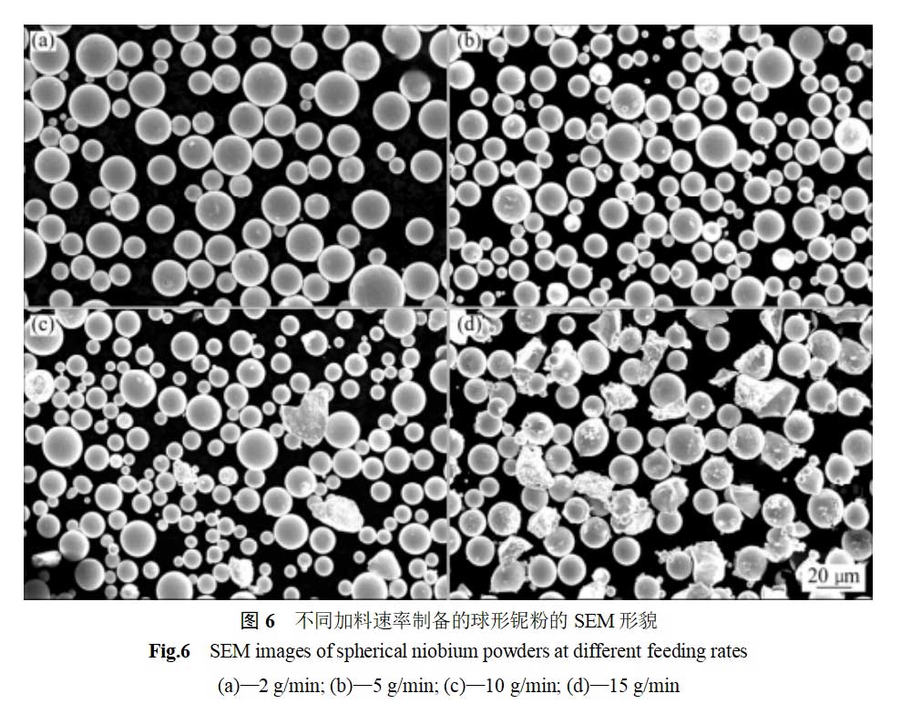 2) The charging rate has a large influence on the spheroidization rate of the powder. With the increase of charging rate, the spheroidization rate of niobium powder decreases gradually. Higher spheroidization rate can be obtained when the charging rate is 2~5g/min.