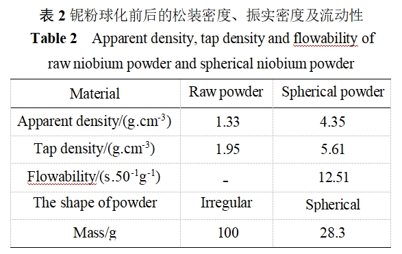 3) The bulk density, solidification density and powder flowability of niobium powder were significantly improved after spheronization. The bulk density increased from 1.33g/cm3 to 4.35g/cm3, and the vibration density increased from 1.95g/cm3 to 5.61g/cm3. The flowability was improved to 12.51s/(50g).