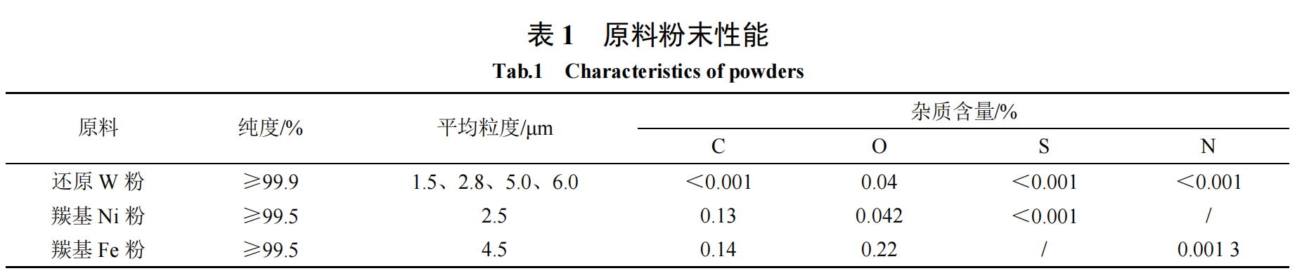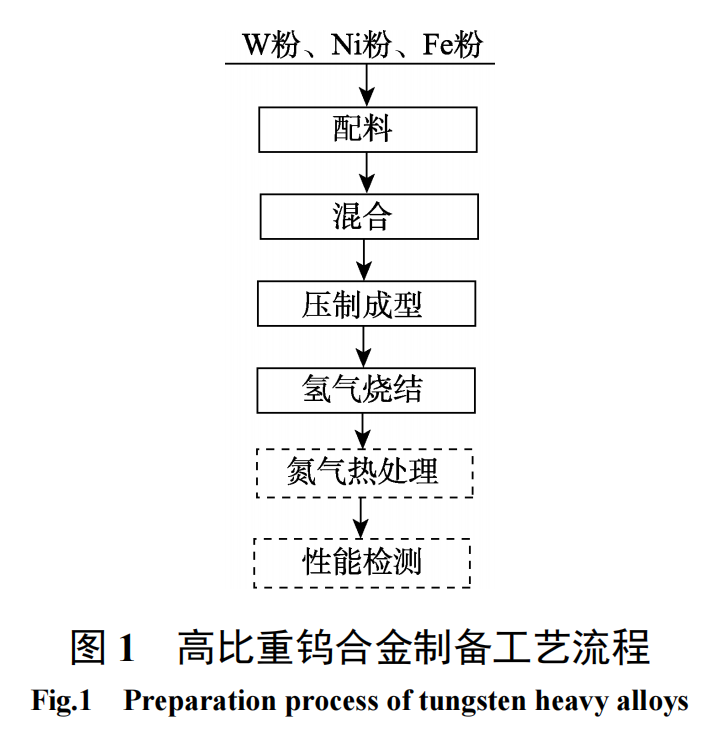 The experiment used reduced W powder, carbonyl Ni powder and carbonyl Fe powder of different particle sizes as raw materials. The raw material powder properties are shown in Table 1. The preparation process is shown in Figure 1: the raw material powder is mixed according to the mass ratio of W:Ni:Fe=93:4.9:2.1, mixed in a mixer for 16 hours and then pressed into a green compact with a diameter of 14 mm×200 mm and a pressing pressure of 4.0 MPa; then sintered in a sintering furnace with a hydrogen atmosphere, a sintering temperature of 1415~1550℃ and a sintering time of 2 hours; solid solution + quenching heat treatment is carried out in a nitrogen atmosphere with a heat treatment temperature of 1240±10℃ and a heat treatment time of 3.0 hours.
