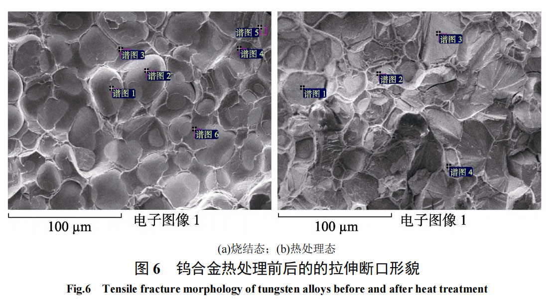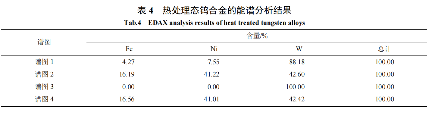 Figure 6 shows the tensile fracture morphology of the tungsten alloy before and after heat treatment, and Tables 3 and 4 are the energy spectrum analysis results of the sintered and heat treated tungsten alloys, respectively. It can be found that after heat treatment, the fracture morphology of the tungsten alloy is transgranular cleavage fracture of tungsten grains, interface separation of tungsten-tungsten grains, and ductile fracture of the bonding phase, and there is basically no interface separation of tungsten grains-bonding phase. From the graphs 3 and 4 in Table 3, it can be seen that the tungsten content of the solid solution in the bonding phase of the sintered tungsten alloy does not exceed 30%; from the graphs 2 and 4 in Table 4, it can be seen that the tungsten content of the solid solution in the bonding phase of the heat-treated tungsten alloy is as high as about 42%, indicating that the tungsten content of the solid solution in the bonding phase of the tungsten alloy is also significantly increased after heat treatment. This shows that the 93W-4.9Ni-2.1Fe alloy can be dehydrogenated and eliminate hydrogen embrittlement by sintering in a hydrogen atmosphere and then undergoing a solid solution treatment in a nitrogen atmosphere. Combined with quenching treatment, the strength of the bonding phase can be improved, thereby significantly improving the mechanical properties of the sintered tungsten alloy.
