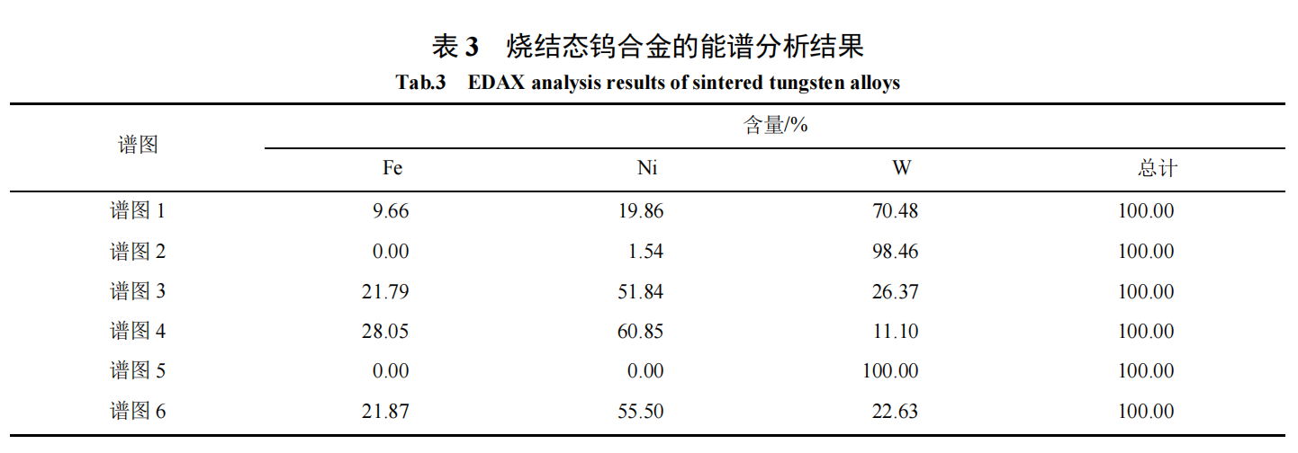 The previous research results show that when 93W-4.9Ni-2.1Fe alloy is sintered in a hydrogen atmosphere, except for the significant improvement of the tensile properties of the alloy when sintered at 1550℃, the tensile strength of the sintered tungsten alloy generally does not exceed 900 MPa when sintered at other temperatures, and the elongation is generally less than 10%. Combined with the fracture morphology analysis, in the sintered tungsten alloy, cracks initiate from the tungsten-tungsten grain interface during the tensile process and then mainly extend along the tungsten-tungsten grain and tungsten grain-binder phase interface. This is because tungsten alloys absorb hydrogen when sintered at high temperature in a hydrogen atmosphere, and the formation of intermetallic compounds in the alloy leads to a decrease in the interface bonding strength of the tungsten grain-binder phase. The 93W-4.9Ni-2.1Fe alloy prepared from 6.0 μm tungsten powder was sintered in a hydrogen atmosphere at about 1 510 ℃, and then subjected to solid solution + quenching heat treatment in a nitrogen atmosphere. The tensile properties before and after heat treatment are compared in Table 2. As shown in Table 2, the tensile strength and elongation of the 93W-4.9Ni-2.1Fe alloy were significantly improved after heat treatment, reaching 978 MPa and 25.7%, respectively, which is consistent with the research results of Ai Xuan [21].