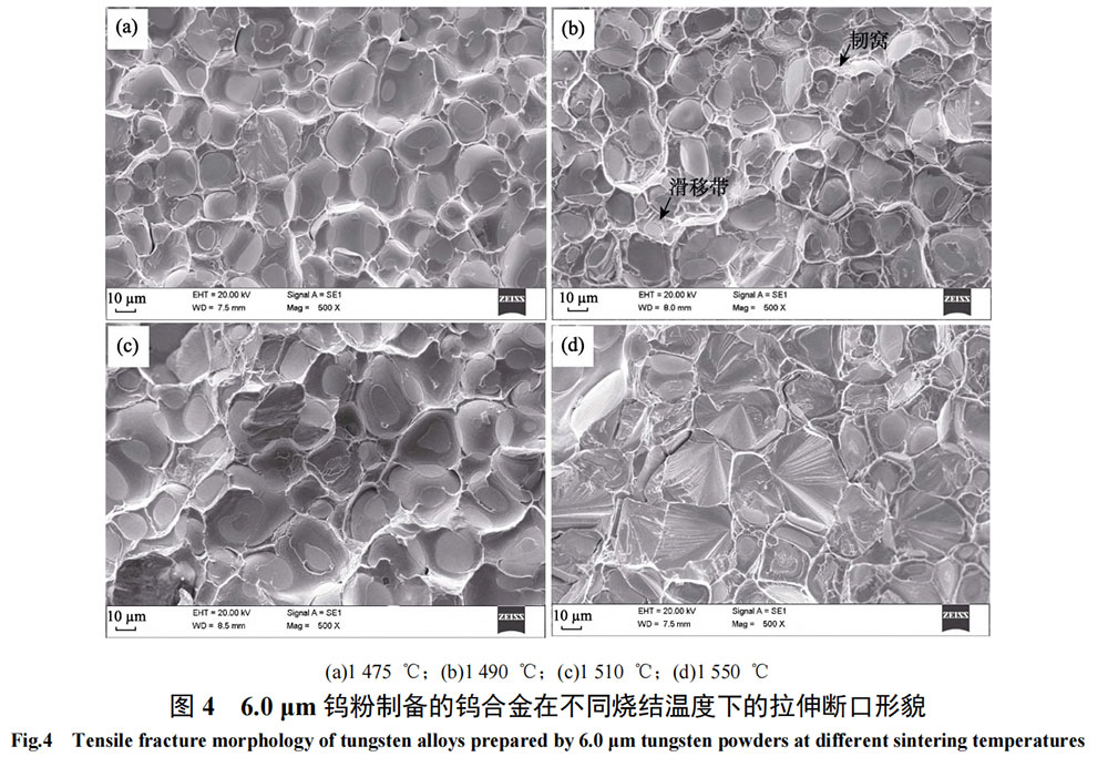 Figure 4 shows the tensile fracture morphology of 93W-4.9Ni-2.1Fe alloy prepared from 6.0 μm tungsten powder after sintering at different temperatures. As can be seen from Figure 4, the tensile fracture morphology of tungsten alloy sintered at 1475℃ is mainly the interface separation of tungsten-tungsten grains and tungsten grains-bonding phase, as well as a small amount of tungsten grain cleavage fracture. When the sintering temperature is 1490℃, it shows obvious tungsten-tungsten grain interface fracture and ductile fracture of the bonding phase, indicating that the interface bonding strength of tungsten grains-bonding phase increases with the increase of sintering temperature. When the applied tensile stress increases, the tungsten-tungsten grain interface is first destroyed, and the bonding phase hinders the expansion of cracks. With the increase of load, the bonding phase undergoes plastic deformation to produce slip bands or dimples, so the alloy has higher tensile strength and elongation at this time. When the sintering temperature reaches 1510℃, the ductile fracture of the bonding phase is significantly reduced, while the interface fracture of tungsten grains-bonding phase is increased. This is related to the isothermal transformation reaction of nickel and tungsten near the sintering temperature, which affects the dissolution and precipitation process of tungsten in the bonding liquid phase, resulting in a decrease in the interfacial bonding strength between tungsten grains and bonding phase. When the sintering temperature is 1550℃, the fracture morphology of tungsten alloy shows a high degree of tungsten grain transgranular cleavage fracture, ductile fracture of bonding phase and a small amount of tungsten-tungsten grain interface fracture. Since the stress value of tungsten grain transgranular cleavage fracture is much greater than the fracture stress value of bonding phase, tungsten-tungsten grain interface, and tungsten grain-bonding phase interface, the presence of a certain proportion of tungsten grain cleavage fracture will increase the macroscopic fracture resistance, thereby improving the tensile strength of tungsten alloy. At the same time, the presence of a large number of ductile dimples in the bonding phase on the fracture indicates that the bonding phase has undergone obvious ductile fracture. At this time, the tungsten alloy has higher tensile strength and elongation.