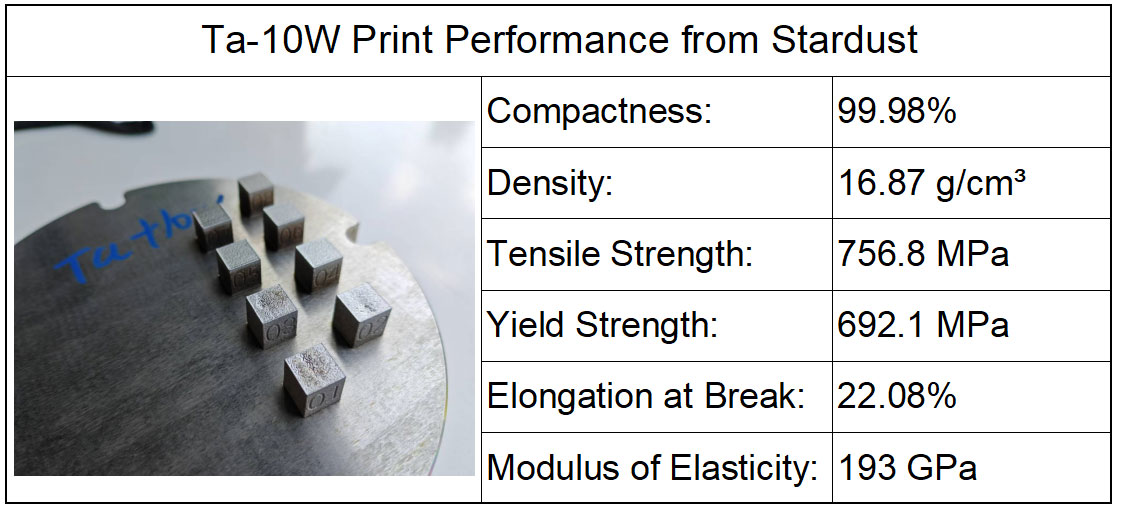 The following are the printing verification parameters of the spherical Ta-10W alloy powder produced by Stardust Technology. For more details, please contact Vicky+86-13318326185