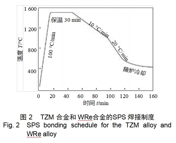 Discharge plasma sintering (sparkplasmasintering, SPS) is a new method of rapid sintering of powders using a strong pulsed direct current flow through the powder or mold to generate Joule heat [7]. In recent years, this method has been used to connect various materials.SPS welding is a connection process in which the material to be connected is placed between two electrodes, and a pulsed DC current is passed in while pressure is applied to produce atomic diffusion at the connection interface by utilizing the special effect of SPS.SPS diffusion welding is fast in heating and low in energy consumption; and the electromigration effect under the action of an electric field accelerates the diffusion of substances [8]. In the paper, the SPS diffusion welding technology was used to realize the efficient connection between TZM alloy and WRe alloy at 1500℃ for 30min, focusing on the microstructure, mechanical properties and thermal fatigue properties of the joints.