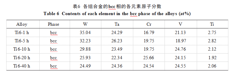 To investigate the effect of ball milling time on the composition of the primary bcc phase in high-entropy alloys, Table 6 presents the elemental contents within the bcc phase for alloys prepared with varying milling durations. The table indicates that during shorter ball milling times (1–10 h), the Cr content in the bcc phase is relatively low. As milling time increases, particularly in the alloy milled for 40 h, the atomic ratios of W, Ta, Cr, and V in the bcc phase approach stoichiometry. This indicates that extended ball milling promotes diffusion among W, Ta, Cr, and V atoms—all sharing the bcc structure—facilitating the formation of bcc solid solutions during sintering. Meanwhile, Ti, which adopts an hcp structure at room temperature, undergoes allotropic transformation to bcc at elevated temperatures. However, Ti exhibits limited solid solubility in W, resulting in lower Ti content within the bcc phase. Furthermore, Ti possesses strong oxygen affinity; during sintering, it reacts with residual oxygen in the powder to form black TiO?.