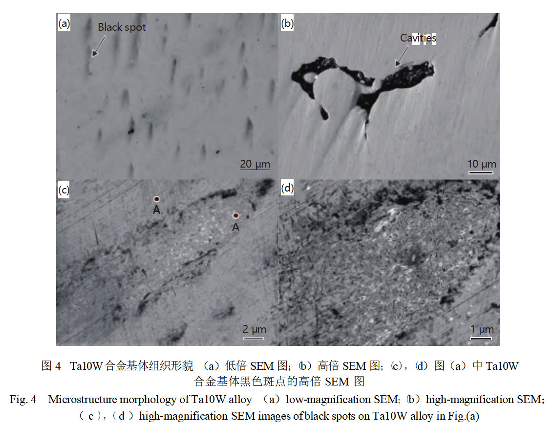 Figure 4(a) displays the SEM morphology of the Ta10W alloy substrate, revealing uniformly distributed black spots and fine pore defects within the alloy matrix. Figure 4(b) shows an enlarged view of the pore defects in the Ta10W alloy matrix, exhibiting irregular strip-like morphology. Figures 4(c) and (d) present enlarged views of the black spots, which consist of a large amount of loose, porous structure. Based on the EDS and XRD results in Table 1 (Figure 3(a)), the alloy matrix is identified as Ta10W. Furthermore, elemental concentrations vary in region (a) of Figure 4, point A within the black spot, and point A' outside the spot. The W content at points A and A' differs by only 1.6%, indicating that the black spots primarily result from a loose, porous microstructure within the Ta10W alloy matrix. In summary, the formation of black spots and fine pore defects stems from the SLM additive manufacturing process, which involves laser melting of powder followed by solidification. This process generates numerous small, regularly distributed micro-melt pools. When significant temperature gradients occur during solidification, uniformly distributed segregation, pores, and other solidification defects form. Numerous literature reports have documented similar phenomena [20-22].