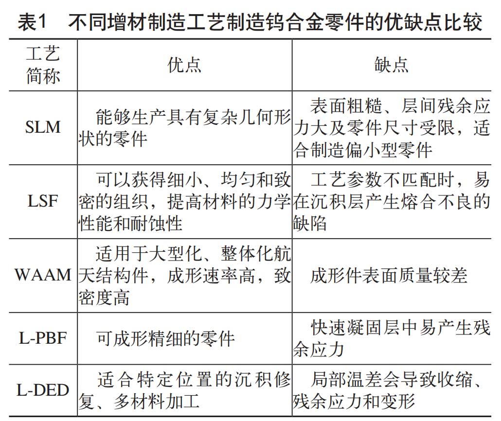 Traditional powder metallurgy methods can only produce blanks with relatively regular shapes. For complex-structured tungsten alloy parts, especially those with intricate cavities, the blanks require complex machining after forming to ultimately meet part specifications. Currently, there are no effective machining methods for complex enclosed internal cavities, which also limits the design possibilities for tungsten alloy parts. Additive manufacturing technologies offer new solutions for designing and producing tungsten alloy parts. Commonly used metal additive manufacturing techniques include Selective Laser Melting (SLM), Laser Stereolithography (LSF), Wire Arc Additive Manufacturing (WAAM), Laser Powder Bed Fusion (L-PBF), and Laser Directed Energy Deposition (L-DED) [5,6]. Table 1 compares the advantages and disadvantages of different additive manufacturing processes for producing tungsten alloy parts. SLM can fabricate parts with complex geometries but suffers from issues such as surface roughness, high interlayer residual stresses, and dimensional limitations, making it suitable for small parts. LSF yields fine, uniform, and dense microstructures, enhancing mechanical properties and corrosion resistance. However, mismatched process parameters may cause fusion defects in deposited layers. WAAM is suitable for manufacturing large, monolithic aerospace structural components with high forming rates and high density, though it produces parts with relatively poor surface quality. Typical tungsten alloy parts manufactured using additive manufacturing technologies are shown in Figure 2. Compared to traditional powder metallurgy methods, additive manufacturing offers distinct advantages in producing complex-structured tungsten alloy parts. It not only enables the fabrication of components with intricate geometries and cavities to meet specialized design requirements but also achieves layer-by-layer material deposition, improving material utilization and reducing costs [7].