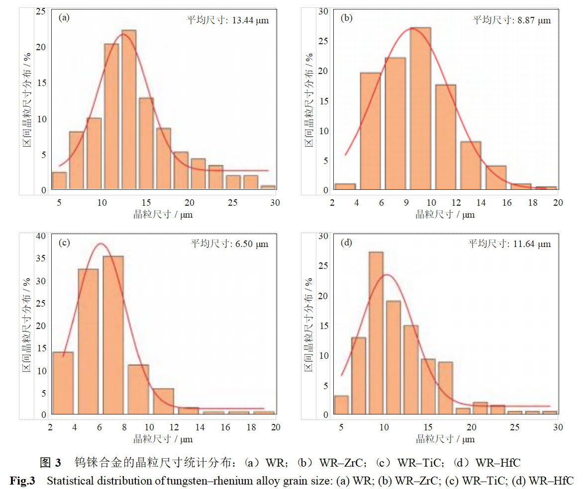The average grain size of the tungsten-rhenium alloy was calculated by statistically analyzing the grain size based on the surface morphology of the alloy, as shown in Figure 3. The average grain size of WR was 13.44 μm, while WR–ZrC, WR–TiC, and WR–HfC exhibited average grain sizes of 8.87 μm, 6.50 μm, and 11.64 μm, respectively. Compared to WR, these values decreased by approximately 34%, 52%, and 13%. The addition of 0.8 wt% refractory carbide second phases refined the grain structure of the tungsten-rhenium alloy. This indicates that during high-temperature sintering, ZrC, TiC, and HfC particles all inhibit grain growth in the tungsten-rhenium matrix, with TiC exhibiting the most pronounced refining effect. As shown in Figure 3(c), the WR–TiC alloy exhibits a narrower grain size distribution, with the majority ranging from 4.00 to 8.00 μm. This indicates a more uniform grain size distribution in WR–TiC, which reduces stress concentration during deformation and enhances the plastic deformation capability of the alloy.